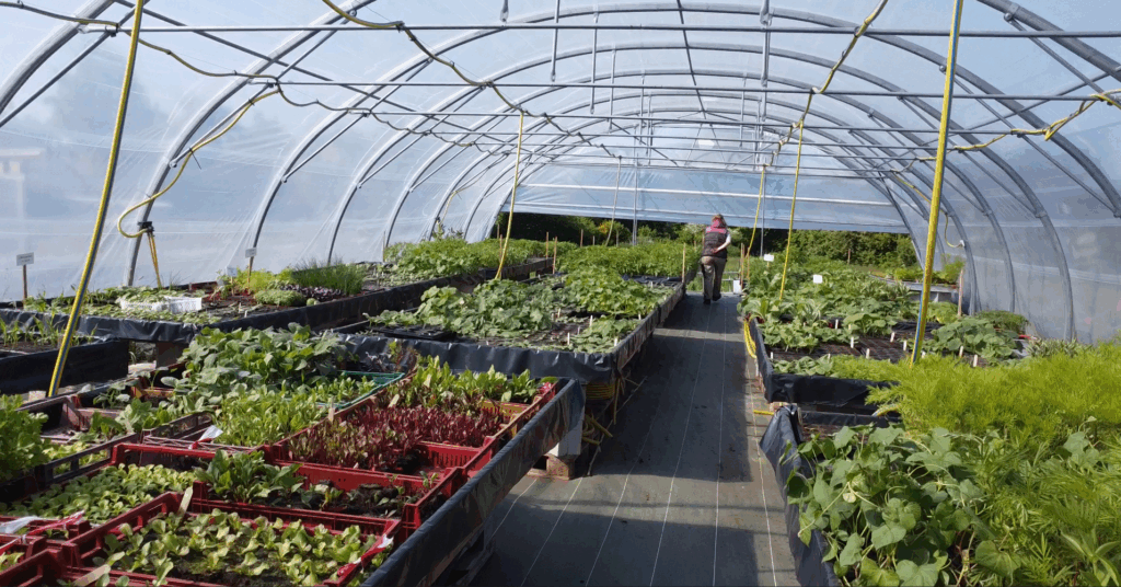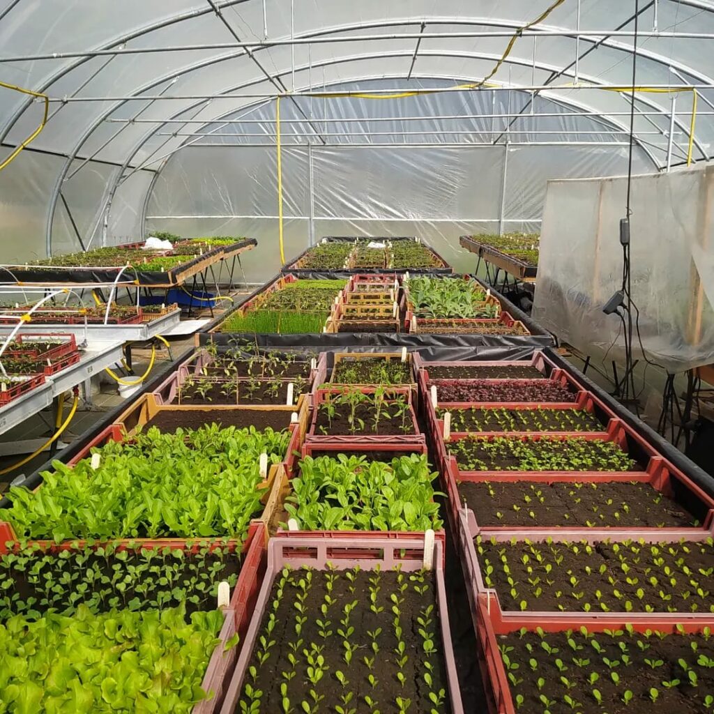 Les deux serres tunnel de 200 m² abritent tous les plants à la vente. Ils sont irrigués par un système de tables à marée qui permet aux racines de chercher l’eau vers le bas, et ainsi de se développer comme elles le feraient dans le sol.